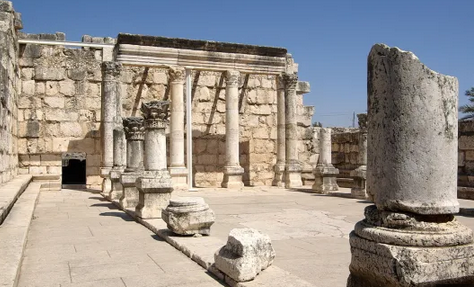 L'une des découvertes les plus importantes à Capharnaüm est la synagogue, datant du IVe ou Ve siècle. Bien que construite après l'époque de Jésus, elle se trouve peut-être sur le site d'une synagogue plus ancienne où Jésus aurait prêché. La synagogue est construite en pierre calcaire blanche, contrastant avec les bâtiments environnants en basalte noir. Elle présente des colonnes corinthiennes, des frises décoratives et des inscriptions en grec et en araméen témoignant du caractère multilingue de cette communauté.