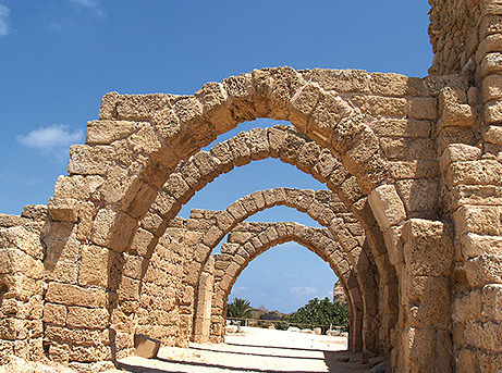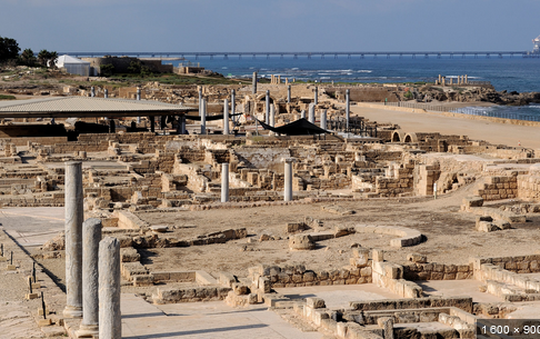 Le port de Césarée qui fut construit par Hérode était l’une des plus grandes merveilles du génie de son temps. Il est le premier grand projet avec des constructions mise sous l’eau. La longueur de la rive Sud pour briser les vagues est de 500 mètres. Le plus gros bloc de pierre mesure 5,50 m. x 1,25 m. x 1,25 m. et pèse plus de 20 tonnes. Le plus grand bloc de béton est 11,50 m. x 15 m. x 2,40 m. Les blocs de béton furent créés avec une forme flottant sur l’eau qui était comblée avec du béton, lorsqu’elle était remplie, elle coulait sur place et le béton durcissait sous l’eau. (Antikforever)