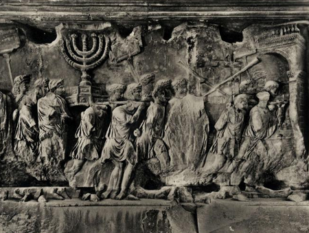Les bas-reliefs de l'Arc de Titus représentent le cortège triomphal du général (Titus n'était pas encore empereur) après la conquête de Jérusalem en 70 après JC. Sur les reliefs apparaissent le chandelier à sept branches ainsi que les trompettes pillées après la destruction du Temple de Salomon. C'est à ce moment que commence la diaspora des Juifs dans l'Empire Romain.