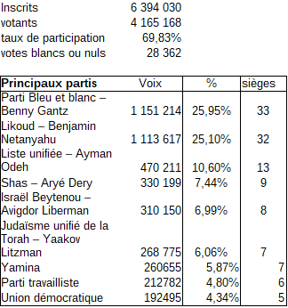Les nouvelles élections ont lieu le 17 septembre sans dégager de majorité. Ni Netanyahu ni Gantz n'arrivent à réunir une coalition représentant la moitié des sièges de la Knesset, nécessaire pour gouverner. Une nouvelle élection (la troisième) est donc prévue pour le 2 mars 2020