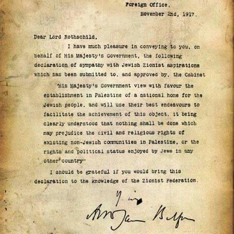 Par une lettre qu'adresse Lord Arthur Balfour, à Lord Rothschild, les Anglais promettent au peuple juif un foyer national. La lettre est publiée dans le Times de Londres le 9 novembre 1917.