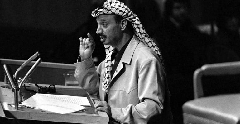 Mohammad Abdel Raouf Arafat al-Qoudwa al-Husseini dit Yasser Arafat se présente à la tribune en uniforme vert olive et lunettes noires avec un pistolet à la ceinture, ce qui est une première (et dernière). Ce fils d'un gazaoui et de la fille d'une famille sunnite de Jérusalem, lui-même né au Caire en 1929, arbore comme à son accoutumée un Keffieh plié en triangle pour évoquer la Palestine. Il dit,