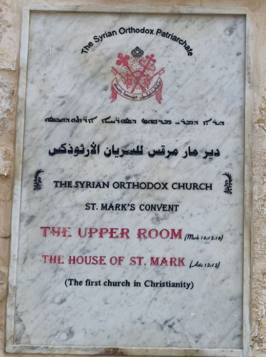 « Ceci est la maison de Marie, mère de Jean - appelé Marc. Proclamée église par les Saint-Apôtres sous le nom de la Vierge Marie, Mère de Dieu, après l'Ascension au ciel de Notre Seigneur Jésus-Christ. Elle a été reconstruite après la destruction de Jérusalem par l'empereur Titus en l'an 73. »