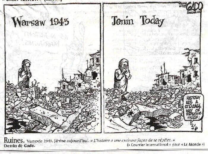 Dans un dessin de Courrier international (issu d’un journal Kenyan) repris par le journal Le Monde daté du 30 avril 2002 on peut voir deux cadres similaires, où une personne qui pourrait être la même regarde un paysage dévasté. Dans le cadre de gauche c’est Varsovie en 1943, dans celui de de droite Jénine en 2002.