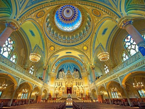 La plus belle partie de la synagogue est l'intérieur de la coupole qui symbolise le monde. Selon les enseignements de la religion juive, il y a trois facteurs importants dans la vie : le travail, la culture et les actions pieuses. Dans le langage biblique, ces trois actions sont exprimées par les quatre mots hébraïques qui ont été peints sur les goussets au-dessus des colonnes soutenant le dôme. Les 24 colonnes du tambour de la coupole symbolisent les 24 heures de la journée et les 24 livres de l'Ancien Testament. Le buisson de roses sauvages au-dessus symbolise quant à lui la Révélation. L'ensemble crée l'impression d'un espace sans fin coloré de fleurs et d'une succession de coupoles sur un revêtement de verre bleu étoilé. En haut, la voûte bleue du ciel rayonne avec, en son centre, au sommet, une Étoile de David.