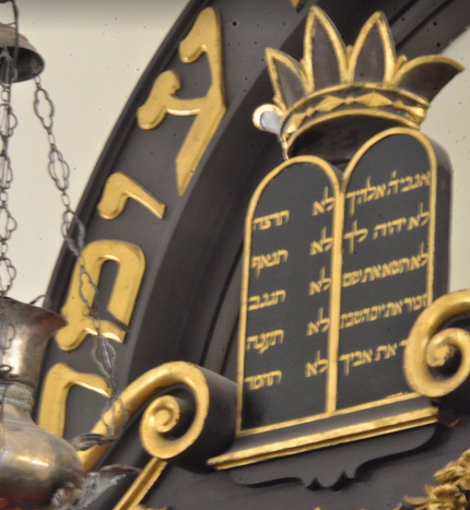 Des tapis orientaux recouvrent le parquet à l'arrière et devant la bimah. Contre le mur à l'avant de la salle de prière, sur la plateforme rouge, quelques marches plus haut, se trouve l'Aron Kodesh. Il est simplement sculpté dans du bois sombre et entouré d'une arche en bois sombre. Deux tablettes contenant les Dix Commandements écrits en hébreu reposent sur l'Aron Kodesh. Une balustrade en bois tourné sombre longe les côtés et traverse partiellement l'avant de la plateforme. Un élégant lustre en cristal et laiton descend entre l'Aron Kodesh et la bimah. À l'étage, la galerie des femmes occupe la moitié arrière de la pièce. Elle est séparée du sanctuaire principal par une balustrade en bois tourné. Des bancs en bois simplement sculptés longent les côtés de la salle de prière, à l'avant seulement, et occupent la seconde moitié de la pièce.