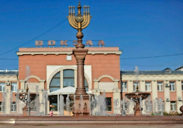 La gare centrale du Birobidjan, d’abord, vaste bâtiment en briques rouges sur lequel trône une enseigne en russe et en yiddish, la langue officielle des lieux. A l’extérieur, une imposante menora dorée, le chandelier à sept branches utilisé lors du Shabbat. Quelques sculptures en bronze de héros populaires complètent le décor, ainsi que deux synagogues, toujours en fonctionnement. Officiellement, 8000 juifs vivent encore dans ces ruelles froides, non loin de la frontière chinoise.