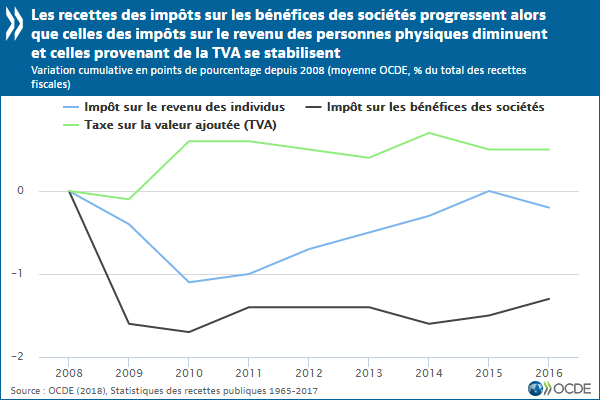 Les données les plus récentes confirment cette convergence, puisque l’IS, en pourcentage du total des recettes fiscales, atteint désormais son plus haut niveau depuis la crise économique et financière mondiale, passant en moyenne de 8.8 % en 2015 à 9.0 % en 2016. Les recettes tirées de l’IS restent inférieures à leur niveau record de 2007 (11.1 % du total des recettes), mais à aucun moment depuis 2009 (8.7 %) elles n’ont été plus élevées qu’aujourd’hui. Au cours de la même période, la part des recettes de l’impôt sur le revenu des personnes physiques dans les recettes fiscales totales a reculé de 24.1 % à 23.8 %.