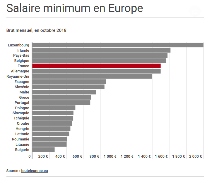 Pour les 22 pays européens ayant un salaire minimum, le montant brut s’échelonne de 260 € en Bulgarie à presque 2 000 € au Luxembourg (en octobre 2018). La France se situe au 5e rang, avec un Smic mensuel brut à 1 498 € :