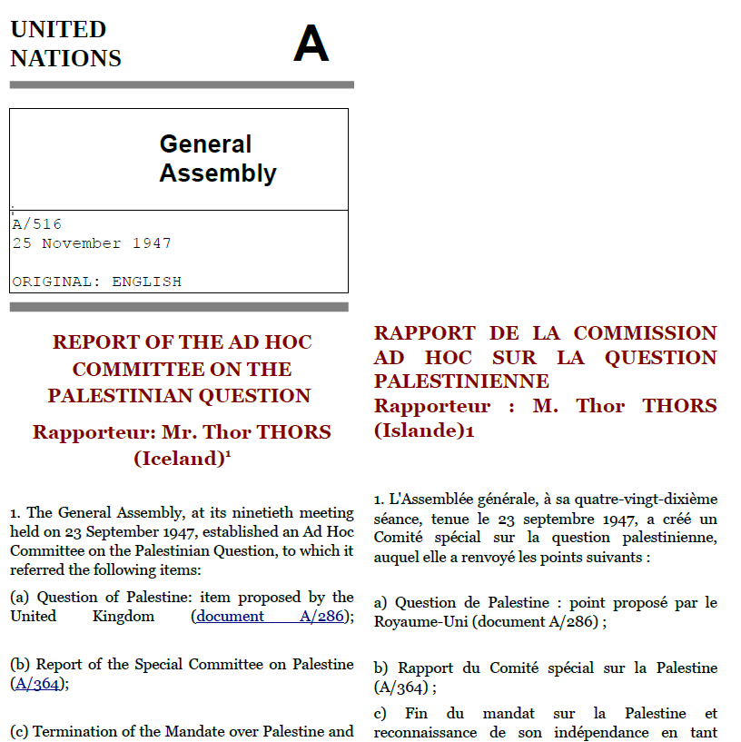 Le rapport spécial ci-dessous reprend aux quelques amendements présentés au début du texte la proposition de partition qui servira pour la construction de la résolution n°181 de l'ONU le 30 novembre 1947.
