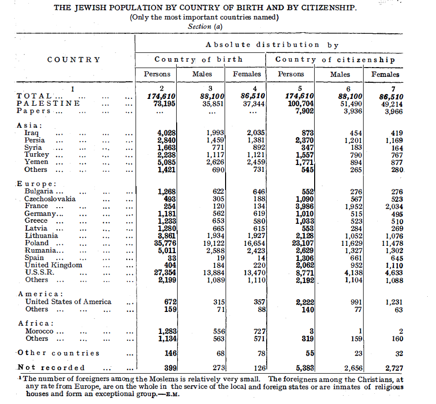 La population de la Palestine au 18 novembre 1931 s'élève à 1 035 821 personnes dont 387 291 vivent dans des villes (p.42) et 66 553 sont nomades (p.18)