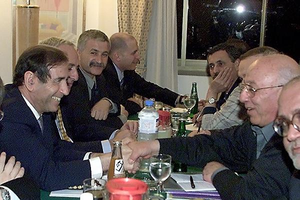 Shlomo Ben Ami ministre des affaires étrangères d’Israël et Ahmed Qorei négociateur palestinien |