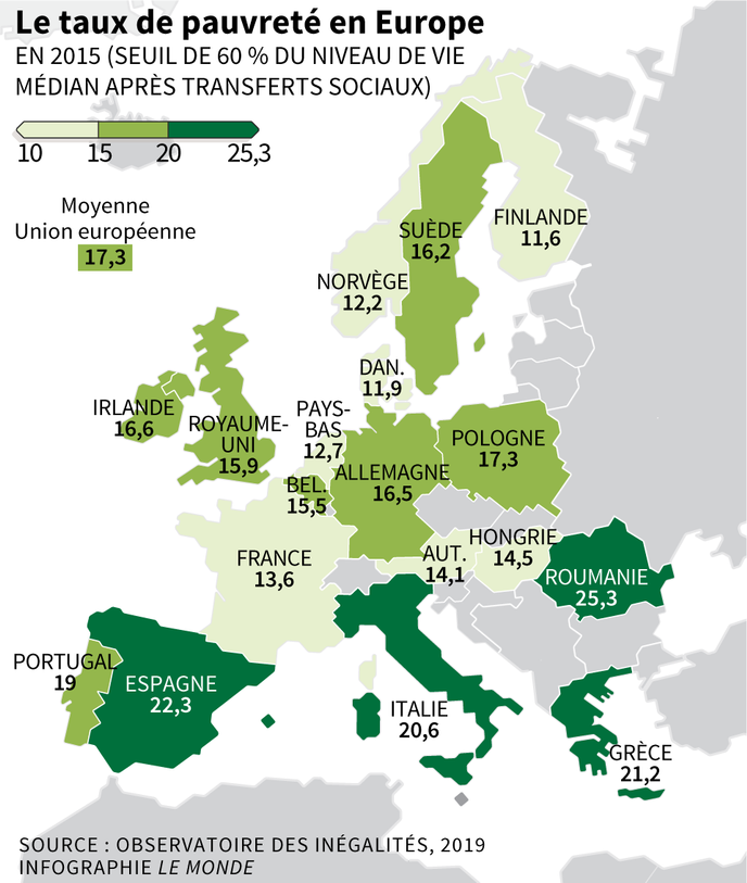 « Mais le système de redistribution à la française fonctionne », affirme M. Maurin. Ainsi, les 10 % des personnes les plus pauvres perçoivent 281 euros par mois avant prestations sociales mais 821 euros après. La proportion de personnes vivant sous le seuil de pauvreté (60 % du revenu médian, soit 1 026 euros par unité de consommation et par mois) atteint 13,6 % en France. C’est l’un des taux les plus bas en Europe, derrière les Pays-Bas (12,7 %), la Norvège (12,2 %), le Danemark (11,9 %) ou encore la Finlande (11,6 %), mais loin devant le Royaume-Uni (15,2 %) et l’Allemagne (16,5 %).