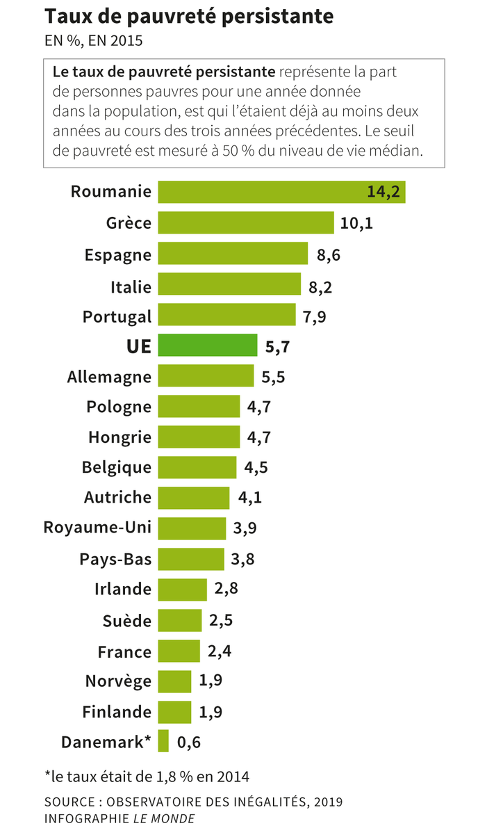 La persistance de la pauvreté est également moins forte en France ; 2,4 % des Français ont connu cet état durant deux ans au cours des trois années précédentes (chiffre de 2015), contre 5,7 % de moyenne en Europe, 5,5 % en Allemagne et 3,9 % au Royaume-Uni. Seuls la Norvège, la Finlande (1,9 %) et le Danemark (0,6 %) font mieux.