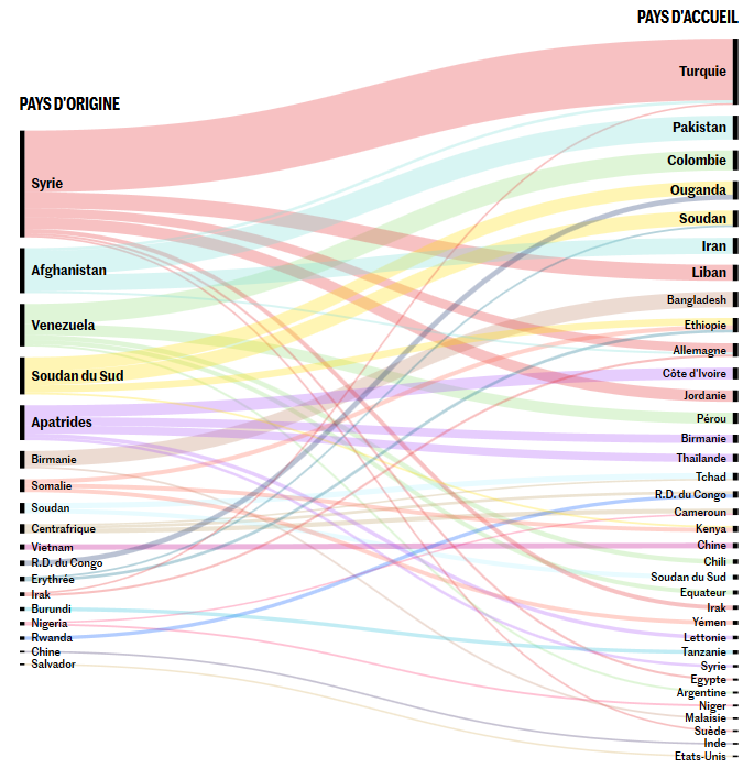 67% proviennent de la Syrie (6,7 m) , l'Afghanistan ( 2,7 m) , le Soudan du Sud (2,3 m) , Myanmar (1,1 m) et Somalie (0,9 m). Viennent ensuite le Soudan, la RDC, la Centrafrique, l'Erythrée et le Burundi