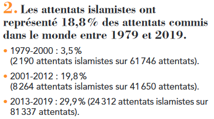 Le rapport rappelle (en conlusion) que les attentats islamistes, loin d'être les seuls, ne représentent "que" 18,8% des attentats dans le monde sur la période 1979-2019,