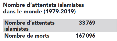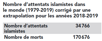 Selon la Fondapol il y a eu de 1979 à 2019 au moins 170 676 morts au cours des 34 766 attentats islamistes recensés (ou extrapolés sur les deux dernières années en leur appliquant la moyenne des années passées).