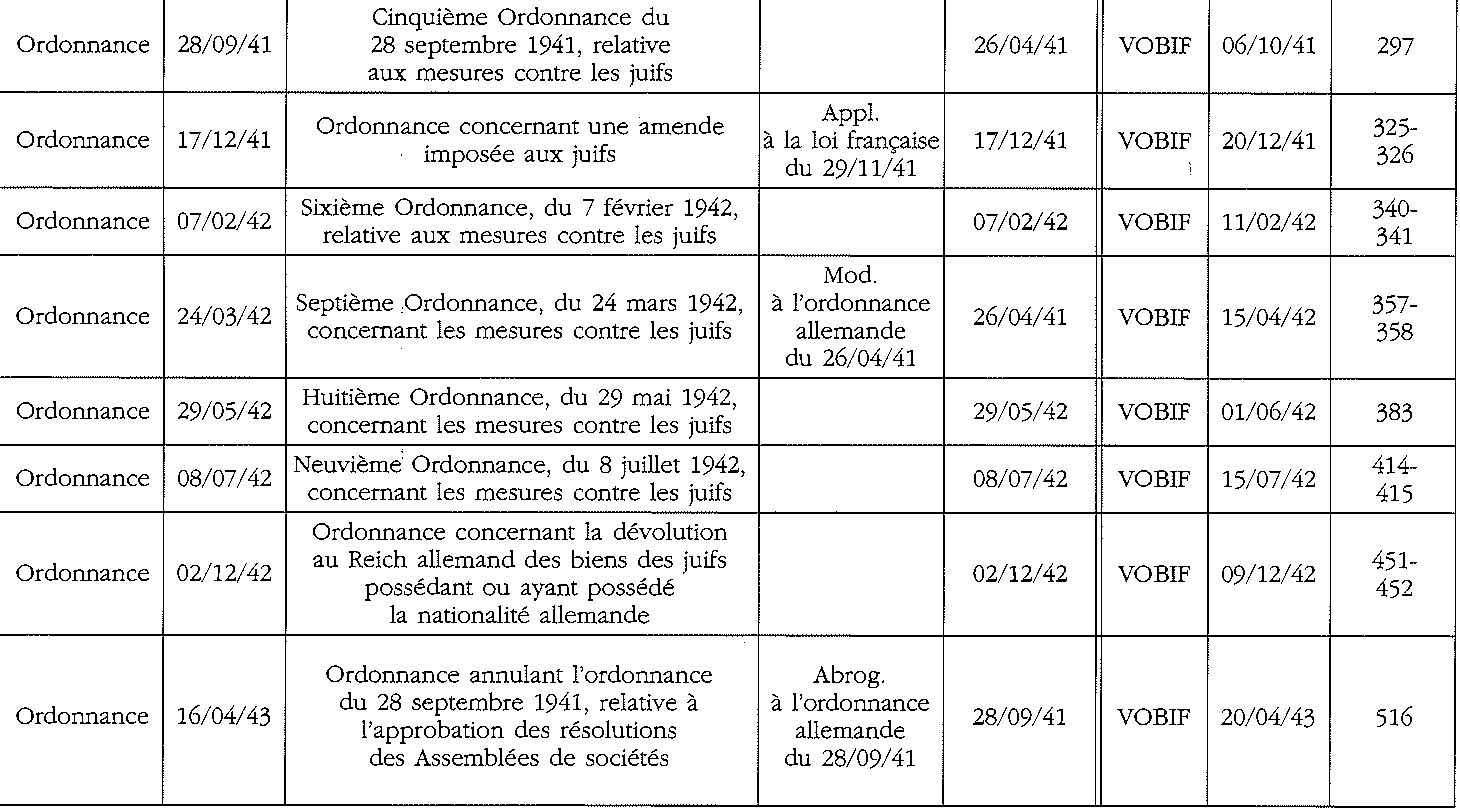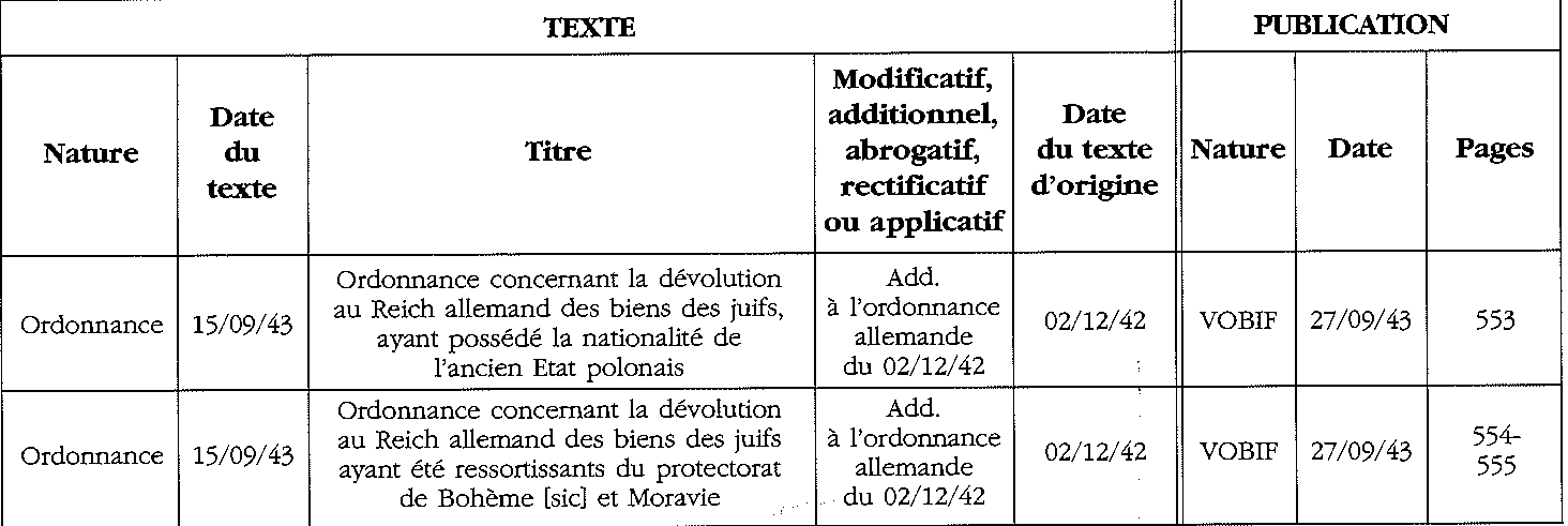 ... Le présent recueil des textes officiels de spoliation et de restitution...permettre à chacun de mesurer en premier lieu l'ampleur du phénomène de spoliation et la part essentielle qu'y prirent les autorités de vichy. La lecture concomitante du journal officiel français, le Journal officiel de la République française (titre porté jusqu'au 4 janvier 1941) puis de l'Etat français, et du journal officiel nazi pour la France, le Verordnungsblatt des Militärbefelshabers in Frankreich, montre hélas que la parenté d'inspiration existant entre les décisions du pouvoir alllemand et les textes édictés par le régime de Vichy.