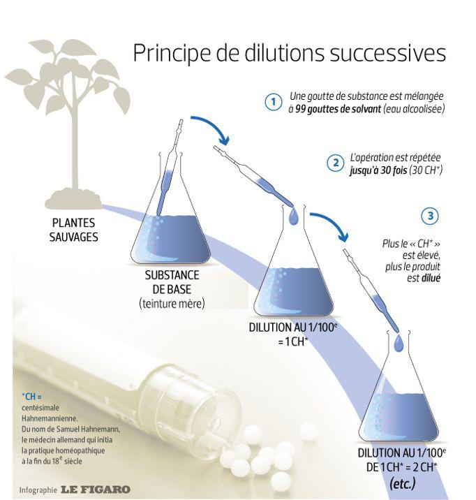 Aujourd’hui, ce procédé de fabrication est toujours en vigueur. Pour fabriquer de l’homéopathie, il faut diluer et dynamiser une «teinture mère», c’est-à-dire une préparation à base de plantes, d’extraits d’animaux ou encore de produits chimiques.