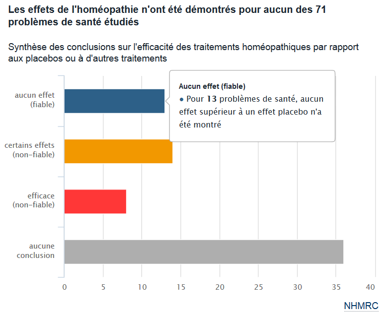 En Australie, En 2014, le National Health and Medical Research Council (NHMRC) australien conclut, dans un rapport, qu'il n'existe pas de preuves fiables concernant l'efficacité de l'homéopathie2