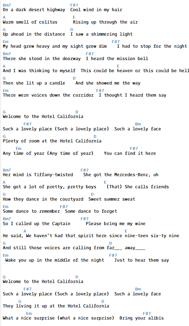 Mirrors on the ceiling, the pink champagne on ice And she said, "We are all just prisoners here of our own device" And in the master's chambers, they gathered for the feast They stab it with their steely knives, but they just can't kill the beast Last thing I remember, I was running for the door I had to find the passage back to the place I was before "Relax, " said the night man, "We are programmed to receive You can check out any time you like, but you can never leave"
