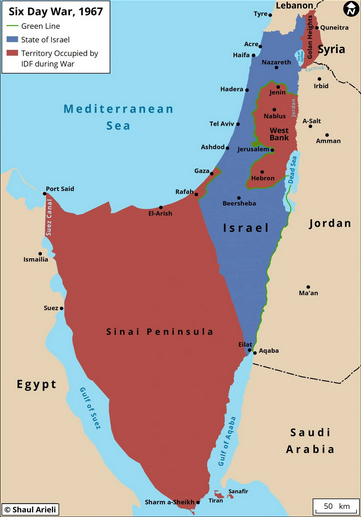 La Cisjordanie 5860 km2 reste occupée, Gaza l'est jusqu'en septembre 2005, le Sinaï est rendu à l'Egypte en Avril 1982