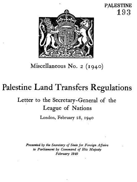 1940 : 28 février - Palestine Land transfert régulation (réglements sur les transfert de terre en Palestine) texte, anglais, cmd 6180