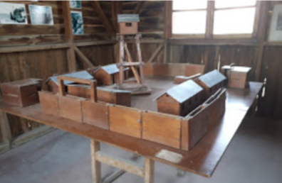 Une fois la tour et le mur installés, des tentes sont montées dans l'enceinte puis des cabanes en bois là aussi préfabriquées.