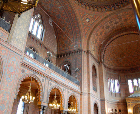 Sa construction s'inspira du climat de l'Émancipation, époque marquée par deux processus apparemment opposés, mais en réalité étroitement liés : l'assimilation des modèles de basiliques chrétiennes et des anciennes synagogues espagnoles, et la recherche d'une identité juive qui s'exprimerait également à l'extérieur par une architecture distinctive. Le résultat global, interprété à la lumière de l'éclectisme de la fin du XIXe siècle, offrait une création novatrice, mêlant des éléments mauresques, romans et byzantins.
