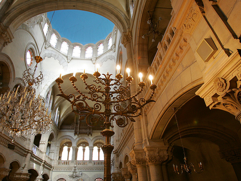Au centre de la nef centrale s'élève la coupole, peinte en bleu, supportée par un tambour percé de seize fenêtres à arc en plein cintre, apportant une lumière naturelle à la salle. À l'extrémité de la nef centrale, vers l'est, se trouve une abside semi-circulaire où est située l'Arche sainte en bois sculpté, contenant les rouleaux de Torah. La porte de l'Arche est cachée par un paro'het (rideau) en velours vert brodé. L'abside est surmontée d'une petite coupole peinte aussi en bleu avec en son centre un vitrail. La Bimah en bois surmonté d'un dais en tissus porté par quatre piliers en bois, est située juste devant l'Arche.