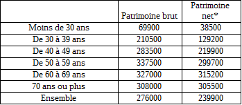 Le patrimoine net moyen (= patrimoine brut - dettes) des ménages s’élève quant à lui à 239 900 euros.