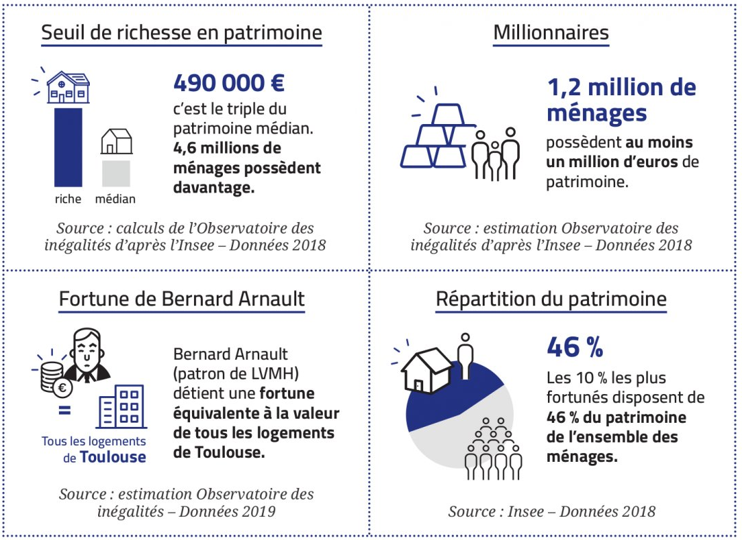 Encore plus qu’en termes de revenus, les inégalités sont grandes chez les riches en patrimoine. Pour entrer dans les « hauts patrimoines », définis par l’Insee comme les 10 % les plus fortunés, il faut posséder au moins 607 700 euros de biens. 2,9 millions de ménages ont ce privilège, ce qui représente probablement environ six millions de personnes. Plus haut dans la hiérarchie des patrimoines, notre pays compte 1,2 million de millionnaires (4 % des ménages). Au sommet, on atteint des sommes difficilement concevables. Même après le choc boursier de mars 2020 dû au Covid-19, Bernard Arnault et sa famille restent à la tête d’une fortune démesurée de 70 milliards d’euros, selon le dernier classement du magazine Forbes. L’actionnaire majoritaire du groupe LVMH possède ainsi l’équivalent de la valeur de l’ensemble des logements de la ville de Toulouse.
