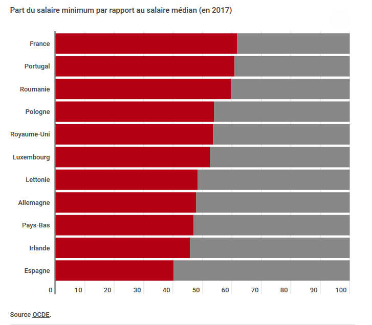 Pour les 22 pays européens ayant un salaire minimum, le montant brut s’échelonne de 260 € en Bulgarie à presque 2 000 € au Luxembourg (en octobre 2018). La France se situe au 5e rang, avec un Smic mensuel brut à 1 498 € :
