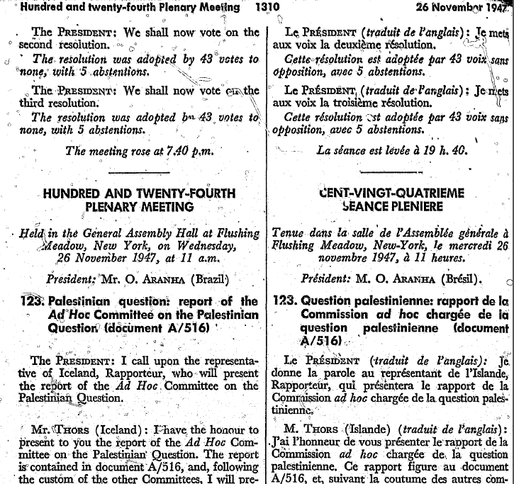 Suite aux deux rapports présentés par les sous comité 1 et 2, le rapport spécial propose le 25 novembre un plan de partition pour la Palestine