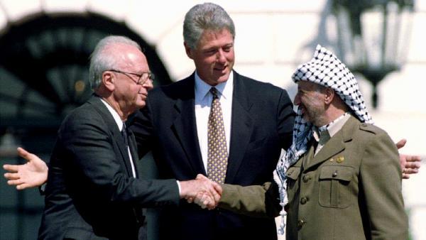 Le 13 septembre 1993, à Wahington, Ytzhak Rabin et Yasser Arafat signent une déclaration de principes :