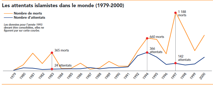Sur la période 1979 - 2000, la violence islamiste fait 6818 morts en 2190 attentats.
