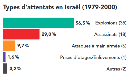En Israël et dans les territoires , sur la période 1979- 2019, ce sont 734 attentats (dont 414 en Israël) qui ont tué 1234 personnes (dont 776 en Israël)