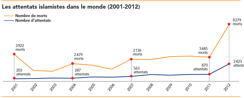 Il recense autant que possible ces violences islamistes sur la période citée Le rapport estime cependant que ses chiffres sont sous-estimés pour plusieurs raisons : information parfois défaillante, motivations des agresseurs parfois non connues ou mêlées à d'autres rendant la cause peu claire, et le dénombrement des victimes décédées après l'attentat, succombant à leurs blessures est difficile.