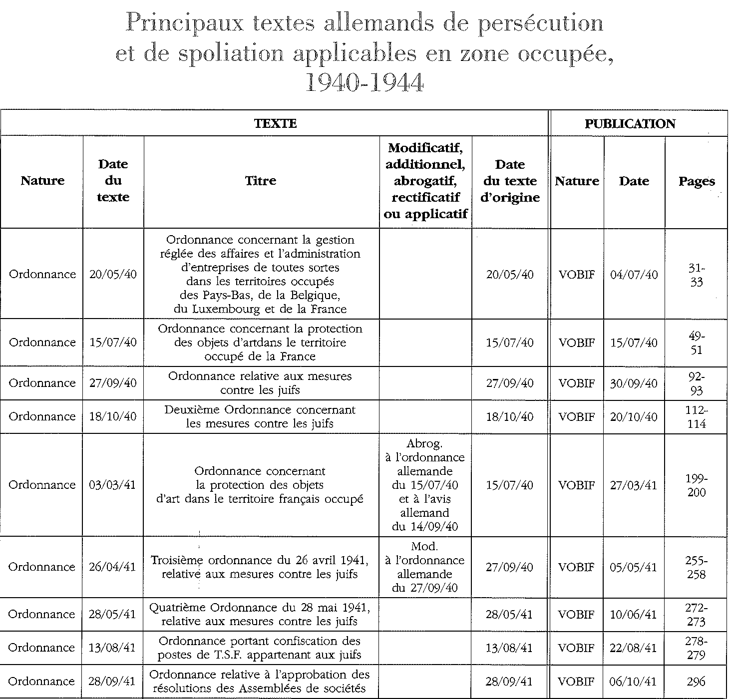 ... Le présent recueil des textes officiels de spoliation et de restitution...permettre à chacun de mesurer en premier lieu l'ampleur du phénomène de spoliation et la part essentielle qu'y prirent les autorités de vichy. La lecture concomitante du journal officiel français, le Journal officiel de la République française (titre porté jusqu'au 4 janvier 1941) puis de l'Etat français, et du journal officiel nazi pour la France, le Verordnungsblatt des Militärbefelshabers in Frankreich, montre hélas que la parenté d'inspiration existant entre les décisions du pouvoir alllemand et les textes édictés par le régime de Vichy.