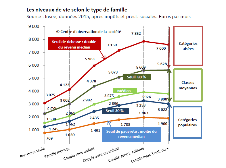 Si on utilise les définitions précédentes, le seuil de pauvreté vaut 769 euros mensuels (données 2015) pour une personne seule [2], 1 491 euros pour un couple sans enfant et 1 963 euros pour un couple avec deux enfants. Les catégories populaires – c’est-à-dire les 30 % les plus modestes, à ne pas confondre avec les personnes pauvres comme on le fait parfois – rassemblent tous ceux qui touchent moins de 1 245 euros par mois pour une personne, 2 435 euros pour un couple sans enfant et 3 253 euros pour un couple avec deux enfants. Le niveau de vie des classes moyennes est situé entre 1 245 et 2 259 euros par mois pour une personne seule, entre 2 435 et 4 378 euros pour un couple et entre 3 253 et 5 609 euros pour un couple avec deux enfants. Les catégories aisées se situent au-dessus de ces niveaux. Si on fixe le seuil de richesse au niveau du double du revenu médian, on devient riche à partir de 3 075 euros mensuels pour une personne seule, 5 963 euros pour un couple et 7 852 euros pour une famille avec deux enfants.