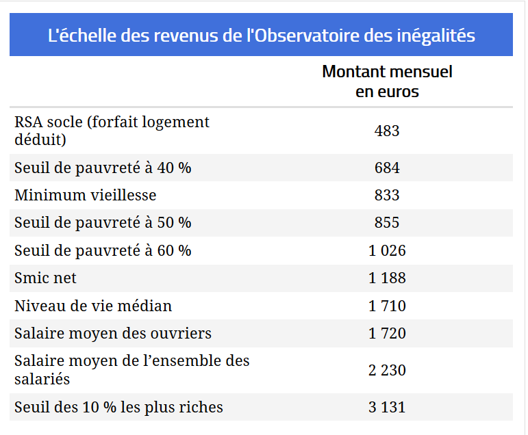 Cette échelle est discutable : les données ne portent pas sur des années identiques et les concepts de revenus (salaires et niveaux de vie) ne sont pas les mêmes. Il faut la considérer comme un ordre de grandeur. Elle nous permet cependant de fixer la distance qui sépare les plus pauvres des couches moyennes. En gros, le rapport va de un à trois. Les personnes les plus démunies vivent avec entre 400 et 600 euros par mois alors que le niveau de vie médian (après impôts et prestations sociales) est de 1 700 euros pour une personne seule.