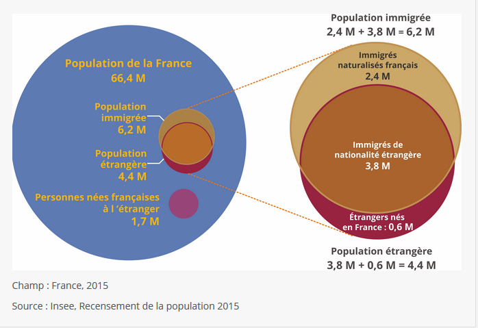 En 2015, 6,2 millions d' immigrés vivent en France, soit 9,3 % de la population totale. 2,4 millions d'immigrés, soit 39 % d'entre eux, ont acquis la nationalité française.
